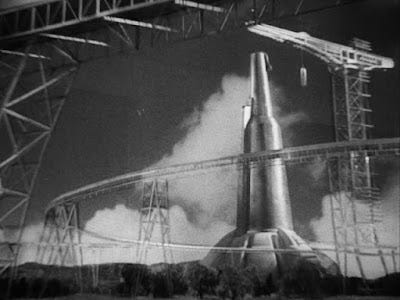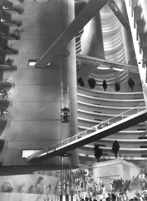 As a theory of history this derives, I’d argue, from H G Wells, and from The Shape of Things To Come (1933); or more specifically from its big-budget screen adaptation (co-written by Wells himself, directed by Alexander Korda) Things To Come (1936).2 Wells’s novel is a future-history that starts in the 1930s, then imagines a devastating war being fought across the world in 1940, a resulting collapse of civilisation, barbarism, warlords and piracy, until a new force arrives out of, of all places, Basra, Iraq: ‘Wings Over the World’, a group of dedicated scientists and technicians who have created a new advanced and indefatigable air-force which flies about the globe outlawing war, decreeing an end to individual nation states, and establishing a techno-utopian world state. The visualisation and designs of this last in the movie was hugely influential, and variants of it reappeared for many decades in modified forms as the template for cleanly antiseptic future utopian infrastructure in myriad SF films and TV shows, from Star Trek to Logan’s Run, from Doctor Who to the Westin Bonaventure Hotel.