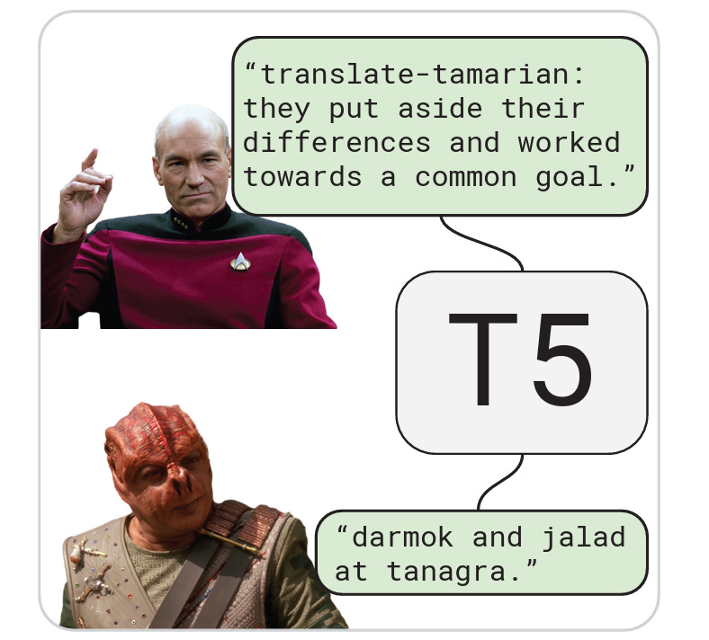 This whole paper is very interesting, although the approach requires Jansen and Graber to find Tamarian ‘equivalents’ for the semantic units of English statements or requests that are likely to be fed into the algorithm. An example they give is: ‘hand me the blue screwdriver on the left’ being broken down into: Temba, his arms wide [‘giving, inviting generosity’], Paris, in the garage [‘screwdriver’], Tolanis painting, in winter [‘blue’], Bakor, examining [‘look to your left’]. I wonder, though, if this is the best way of apprehending what is going on with this language.