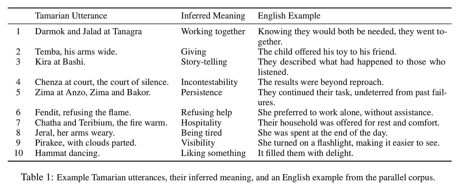 In their essay ‘Picard understanding Darmok: A Dataset and Model for Metaphor-Rich Translation in a Constructed Language’, Peter A. Jansen and Jordan Boyde Graber collate all the canonical instances of Tamarian (from this episode of the show, and from spin-off Trek novelisations) into a database of 48 terms, by way of assembling a preliminary mechanical English-Tamarian translator. The image at the head of this post is a diagram of this translation-programme in action, from their paper. They also include this table: