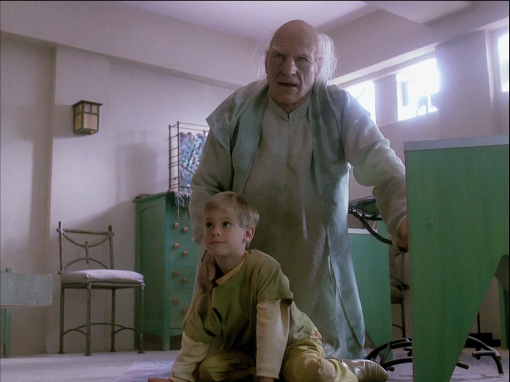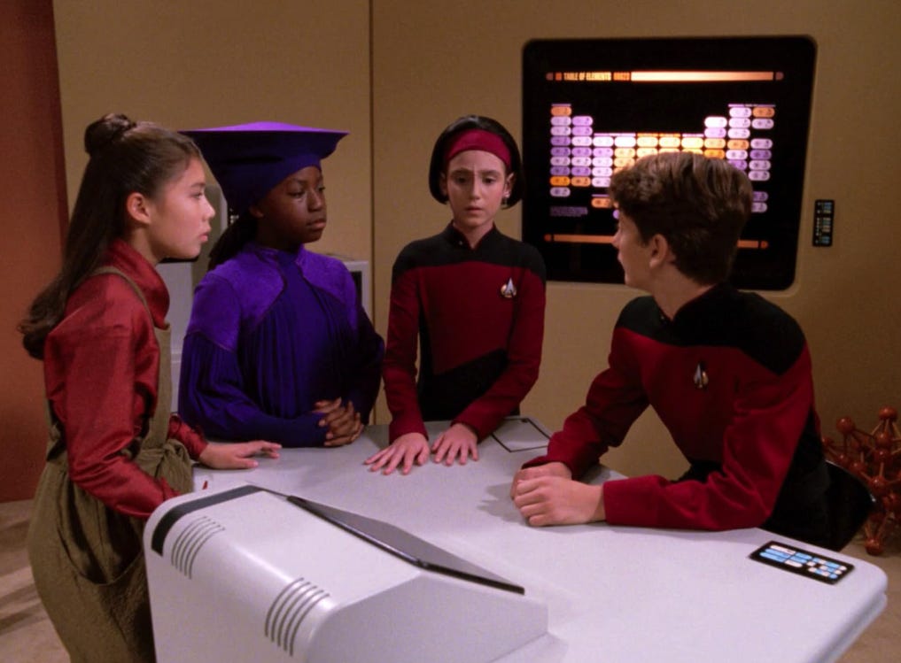 Come at this from the other side. In the episode ‘Rascals’ (TNG S6 ep7) a ‘transporter malfunction’—one of the laziest, handwaveiest shifts in Trek, this—turns Picard, Ensign Ro, Guinan and Keiko into their childhood selves (it also somehow shrinks their uniforms to fit their childish bodies).